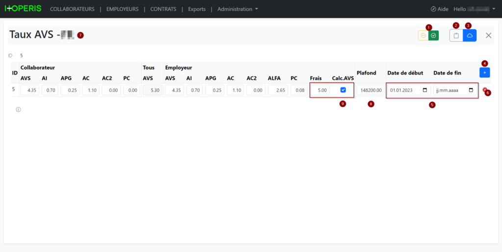 - Le taux AVS est appliqué pour une période de date, s’il change, vous pouvez indiquer une nouvelle période de validité.