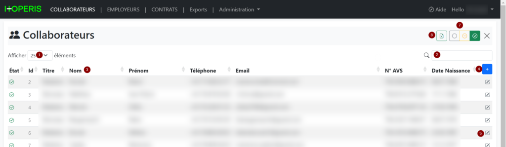 - Filtrer la liste selon le status de la fiche collaborateurs [ Tous (Différentiables avec les icones) | Désactivés | Actifs ]