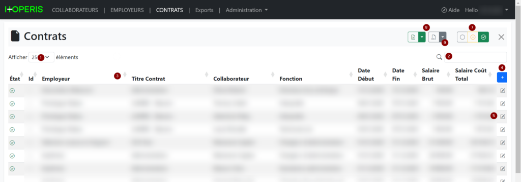 - Filtrer la liste selon le status du contrat [ Tous (Différentiables avec les icones) | Désactivés | Actifs ]