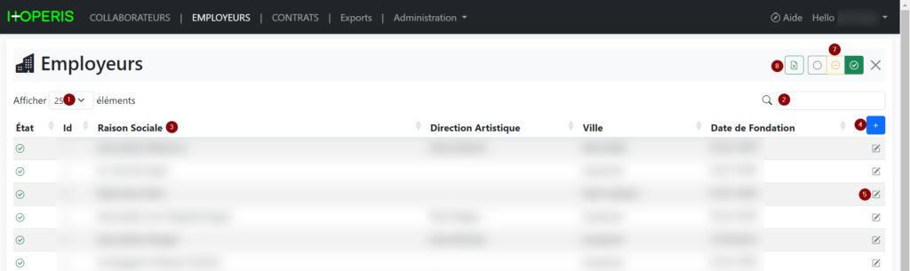 - Filtrer la liste selon le status de la fiche employeurs [ Tous (Différentiables avec les icones) | Désactivés | Actifs ]