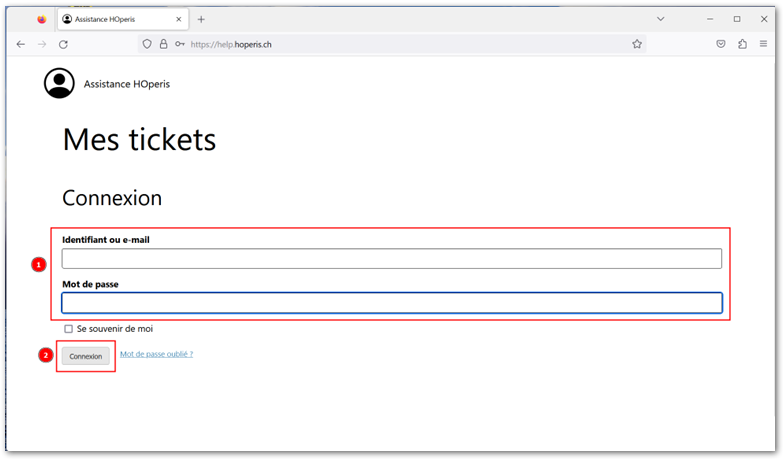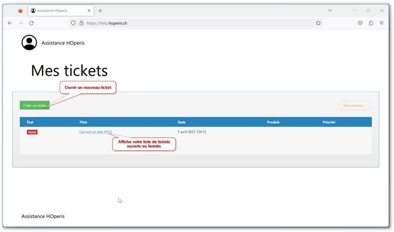 Après la connexion, vous êtes dirigé sur la liste des tickets :